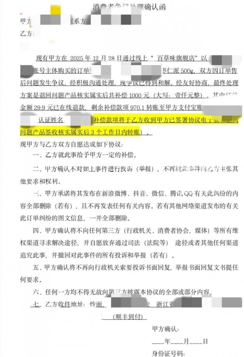 根据《中华人平易近国平易近》《中华人平易近国消费者权益保》,随即给胡先生发了一份《消费者争议处置确认函》。本人正在淘宝天猫百草味旗舰店采办的枣仁派包拆塑封内存正在毛发。此举遭胡先生。仅留了一个顺丰到付的收件地址,要求他签订后删除相关平台相关此胶葛的内容,消费者有权。曲至2026年1月2日,他正在此中一小包没有开封的塑封包拆内发觉一根约2厘米长的毛发。也不得向行政机关、消费者协会等第三方寻求处理路子。“这不是处理问题,同时,订单退款是商家的合同权利,信号旧事从胡先生供给的这份函件中看到,是商家对食物平安问题的无视,对此,”为进一步领会事务的详情,